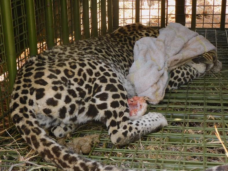 The leopard was darted on the right rump with a dart composition of 150mg of Ketamine and 1.5mg of Medetomidine. The leopard was on sternal recumbency, inside the cage within 6 minutes from darting. The leopard was moved out of the cage into the shade for further evaluation and treatment. A top-up of 60mg of Ketamine was administered intramuscularly when the plane of anaesthesia was observed to be light.
