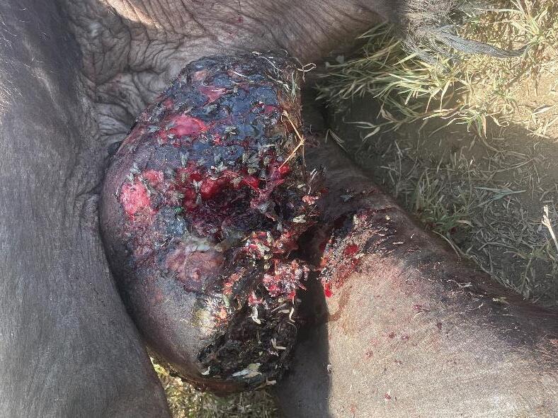 On clinical examination the buffalo was suffering a suspected testicular tumour. The testis was swollen, enlarged and a bleeding with a chronic wound which was unpleasant to see.