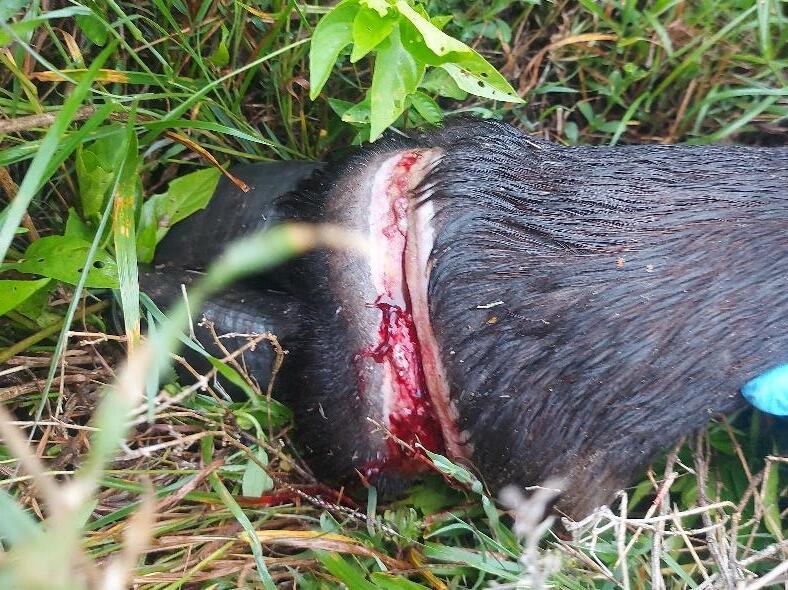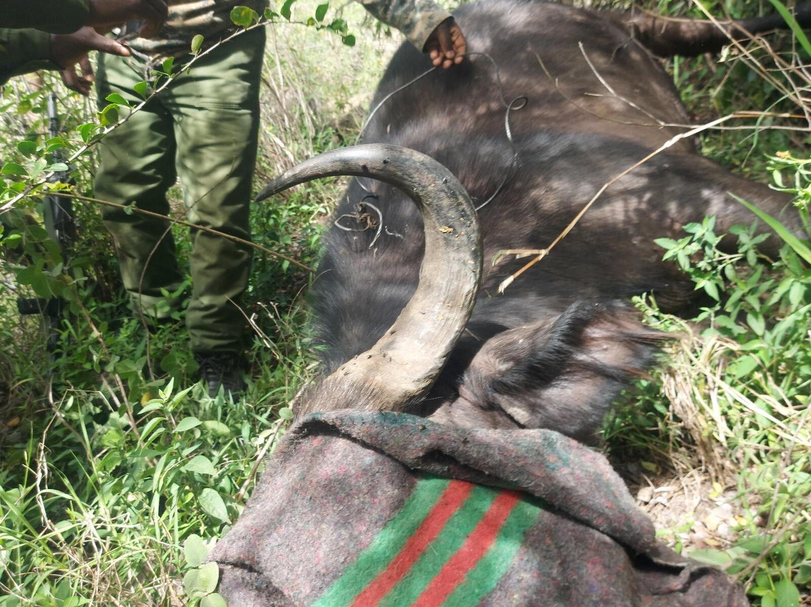 On examination the buffalo had been wounded by a wire snare on right hind leg Poaching Death