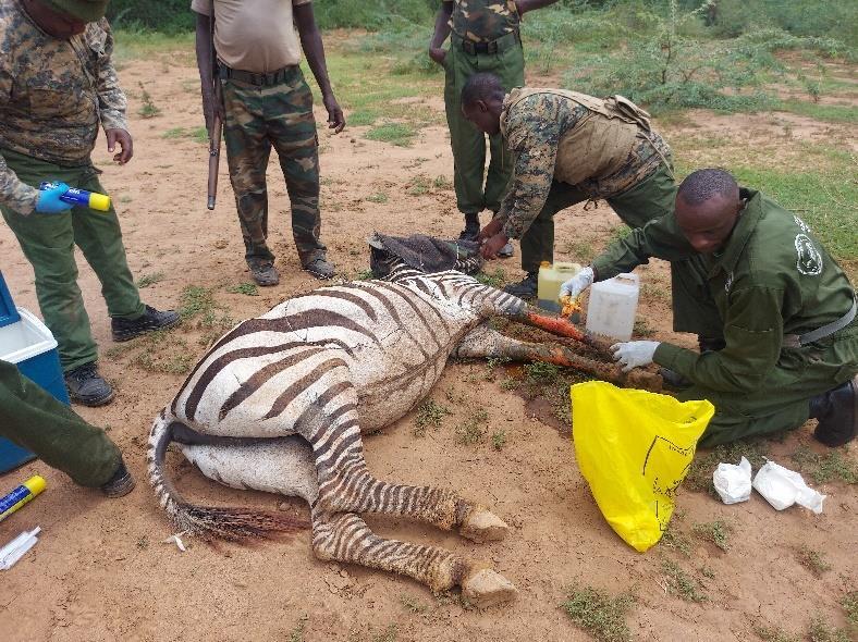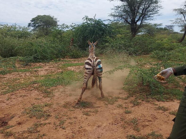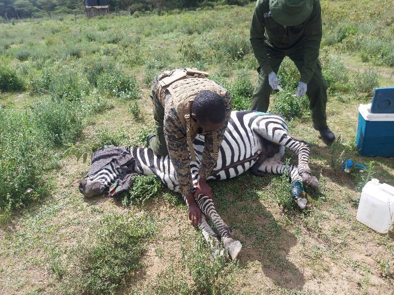 This zebra was darted using 5mg Etorphine plus 80mg Azaperone. On examination the male zebra had been snared and wounded by a long-barbed wire on neck. The zebra had also suffered wounds on both hind and front leg caused by the snare. The wounds were infected and bleeding. We cleaned the infected wounds using water and rinsed the same using tincture of Iodine. A fly repellent (Alamycin® Aerosol) was applied.