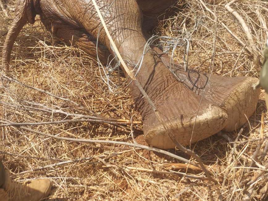 A SWT/KWS De-snaring Unit spotted this adult elephant bull dragging a wire snare secured on his right hindlimb.