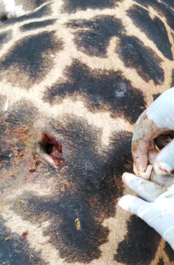Examination revealed a thick winch wire snare around the neck of the giraffe, luckily the snare had not inflicted any injuries. The snare was cut immediately using wire cutters.
