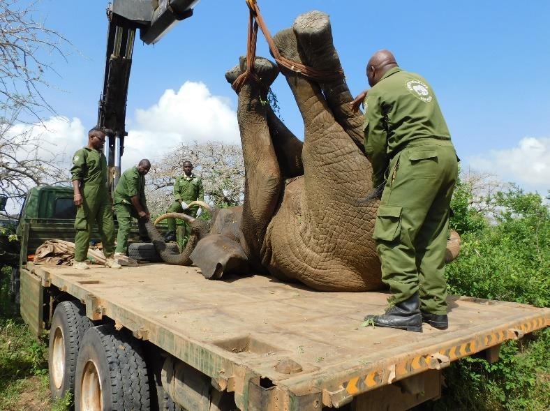 The elephant had no wounds or any visible physical anomalies. The bull was lifted using a crane and loaded into the transport vehicle. The elephant was transported under sedation and arrived at Shimba Hills National Park with no complications. Due to the distance, the anaesthetic was topped with 5mg Etorphine to reduce trunk mobility.