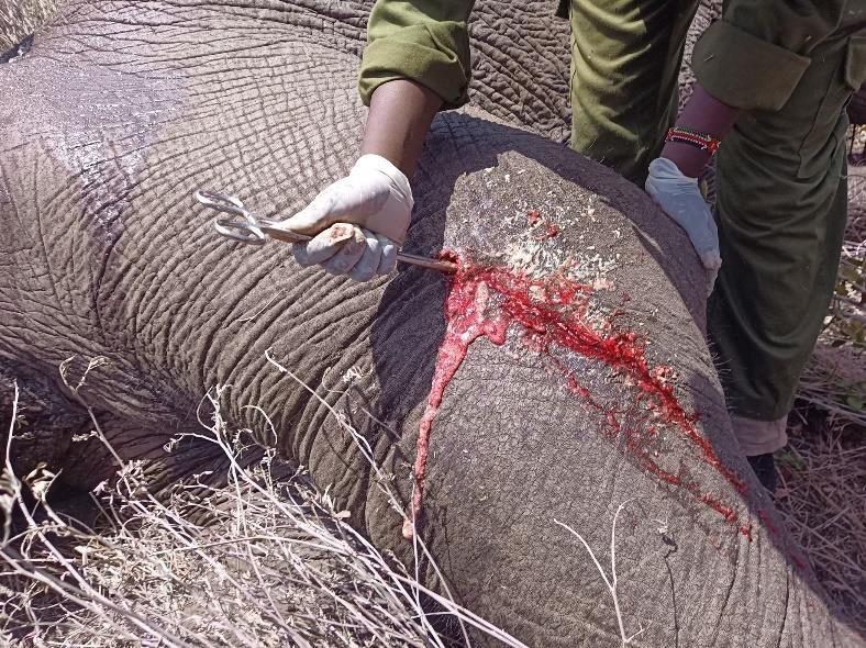 The elephant bull was successfully immobilized with 20mg Naltrexone hydrochloride delivered remotely in a 3cc Dan inject dart. Darting was done from the helicopter, and it took 9 minutes for the drug to take effect Examination revealed an arrow wound on the left flank that was oozing pus, the wound was beginning to heal and had formed fibrous tissue around it. Additionally, another arrow wound was observed on the left rump, it was also oozing pus. Both wounds were thoroughly cleaned and debrided, flushed with Hydrogen peroxide, rinsed with clean water, and infused with tincture of Iodine. The wounds were thereafter packed with antibiotic pessaries and topical antibiotic spray applied. Additionally, the bull received Amoxicillin antibiotics and Flunixin anti-inflammatories parenterally. Anaesthesia was reversed with 250mg Naltrexone hydrochloride given intravenously via a prominent ear vein