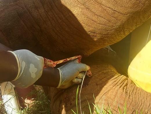 Examination revealed a deep septic spear wound on the lateral upper thigh of the left hind limb. The wound was thoroughly cleaned and the pus evacuated from the wound. All devitalized tissues within the wound were debrided, this was followed by flushing with Hydrogen peroxide, rinsing of the wound thoroughly with water then infusing it with Iodine and packing it with antibiotic pessaries. Topical antibiotic spray was applied thereafter. Other treatments given include parenteral administration of Amoxicillin and Clindamycin antibiotics. The elephant also received shots of Dexamethasone anti-inflammatory