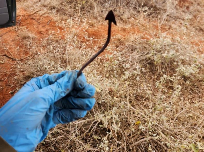 Examination revealed a deep spear wound on the right forelimb at the proximal humerus. Small fragments of bones were retrieved from the wound. It was suspected that the elephant had suffered a fracture of the humerus from the spear blow. There was also an arrow wound on the proximal side of the right femur which appeared to be healing. Additionally, she was in a poor body condition. Both wounds were thoroughly cleaned with water, flushed with Hydrogen peroxide, rinsed with water and infused with tincture of Iodine. The wounds were thereafter topically sprayed using an antibiotic. She also received shots of Amoxicillin antibiotics, a metabolic stimulant and Flunixin anti-inflammatories parenterally.