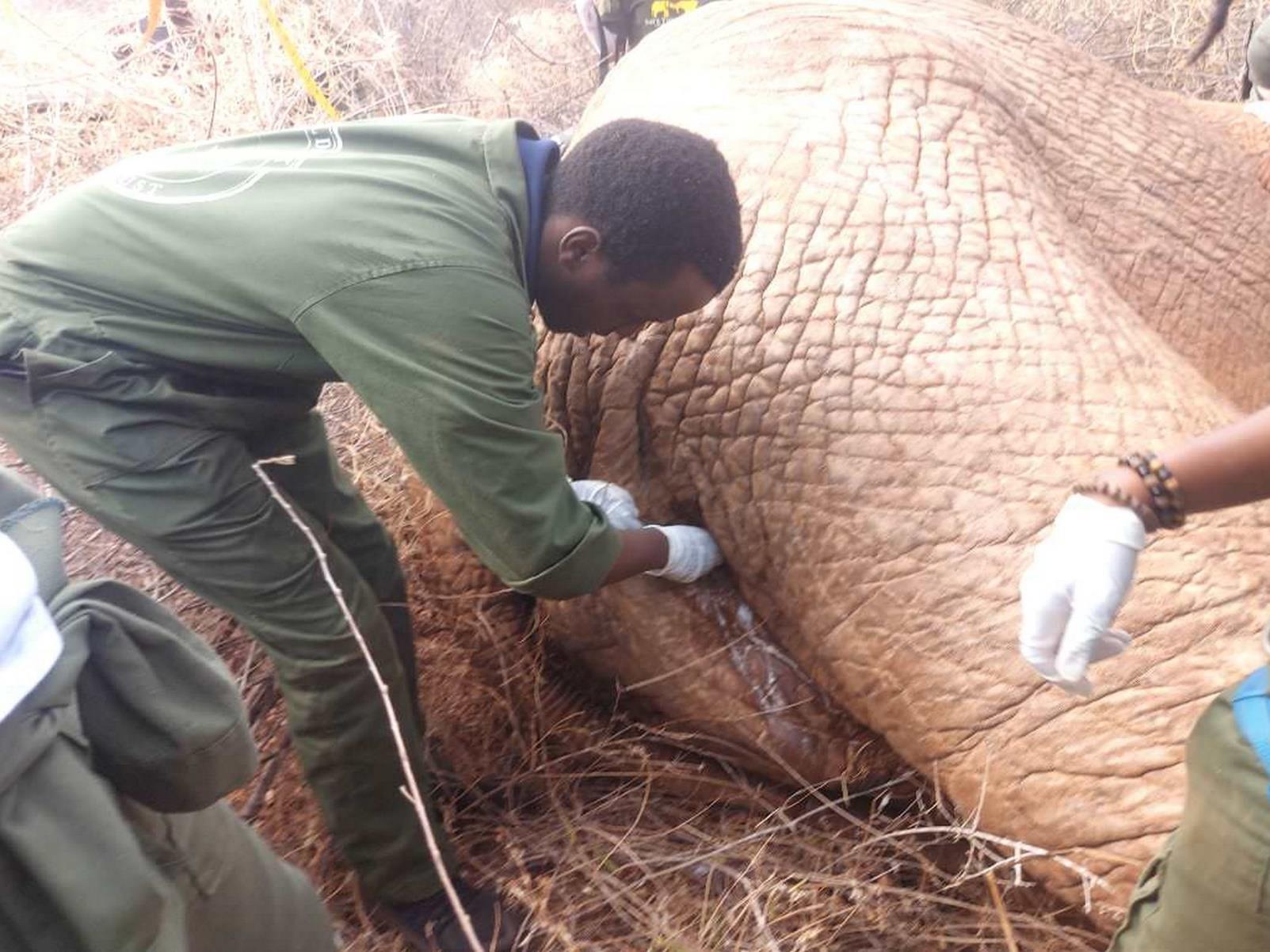 This elephant was spotted by the Wildlife works/KWS Rangers with a tight wire snare round the head.
