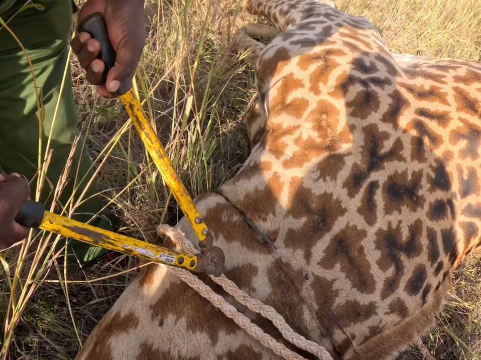 The zebra was immobilized with 7 mg Etorphine and 60 mg Azaperone, and the drugs took effect within 7 minutes. The animal was in good body condition. The wire snare comprised several strands that were firmly bound around the neck, a section of the long snare had also entangled the zebra’s right hind leg inflicting a wound at the proximal end of the hock joint. The zebra was freed of the snare then devitalized tissues on the wound were removed. The wound was then debrided with Hydrogen peroxide, rinsed with Iodine and topical antibiotic spray applied. Long-acting Amoxicillin antibiotics and Flunixin meglumine anti-inflammatories were injected intramuscularly then anaesthesia was reversed with 36 mg Diprenorphine hydrochloride delivered intravenously through the jugular vein. The zebra woke up 2 minutes post reversal and joined other zebras nearby.