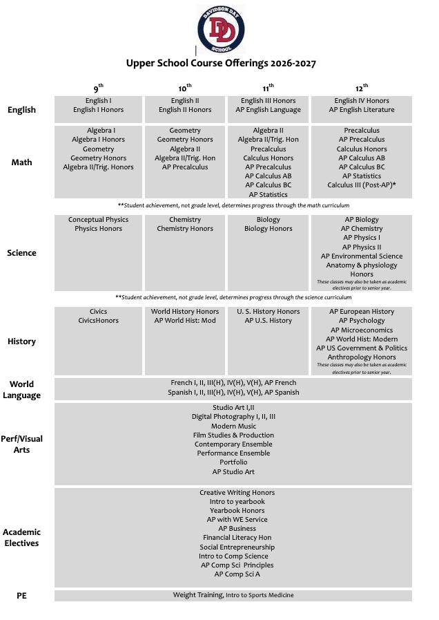Davidson Day School offers a wide variety of curricular options, including electives in each academic department At times, however, a student may have a sincere passion for a subject not offered by the school, or may wish to explore in more depth some facet of a subject first encountered in a regular class