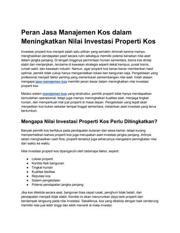 Peran Jasa Manajemen Kos dalam Meningkatkan Nilai Investasi Properti Kos