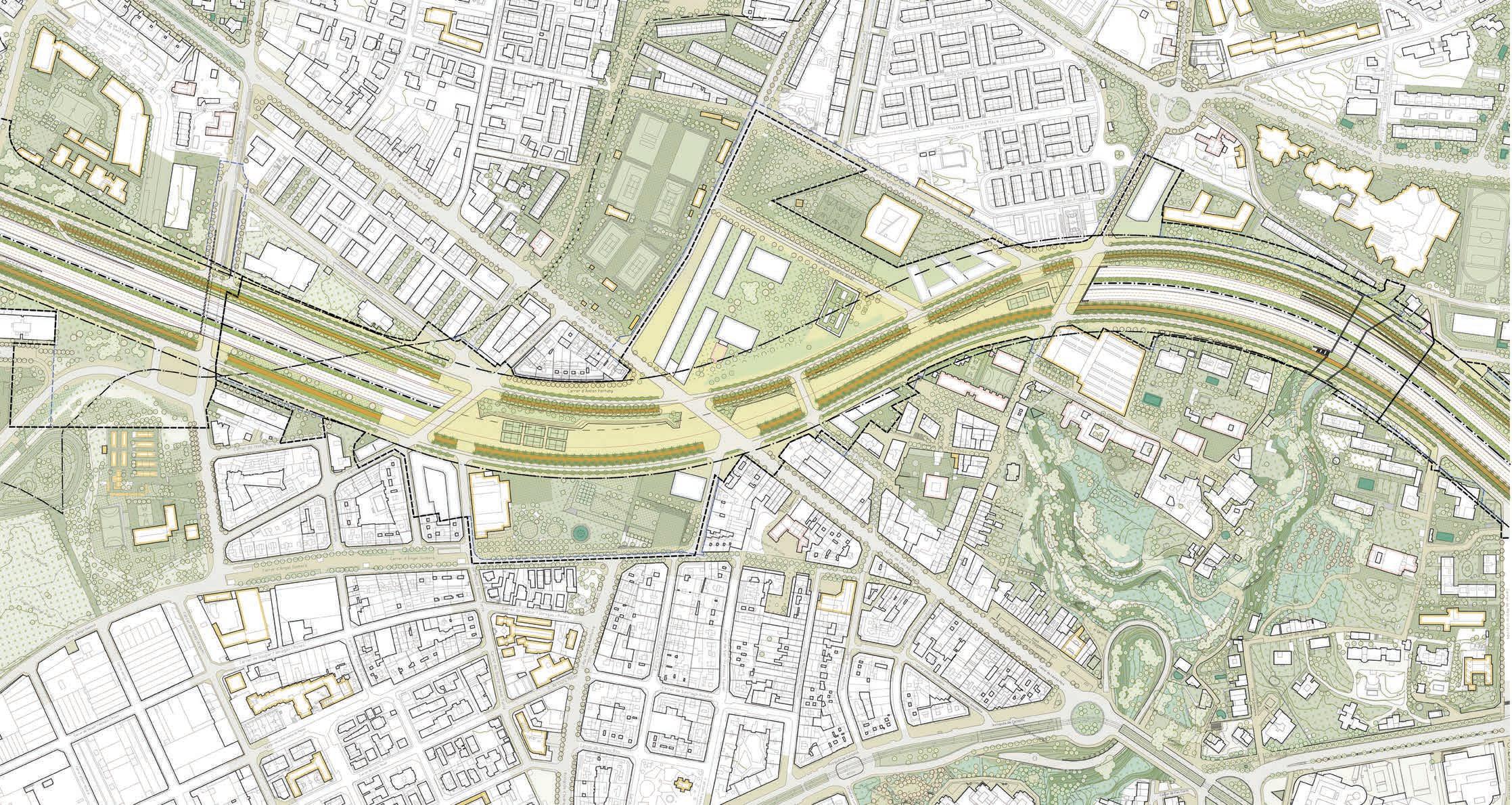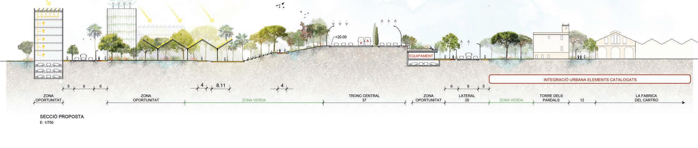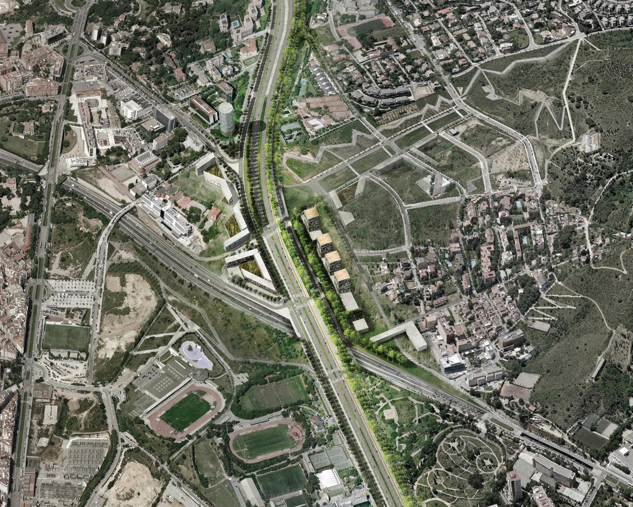 un nou eix urbà, que en el límit entre esplugues i barcelona en contacte amb la falda del parc natural de collserola, pugui també fer possibles la connexió entre el mar i la muntanya.