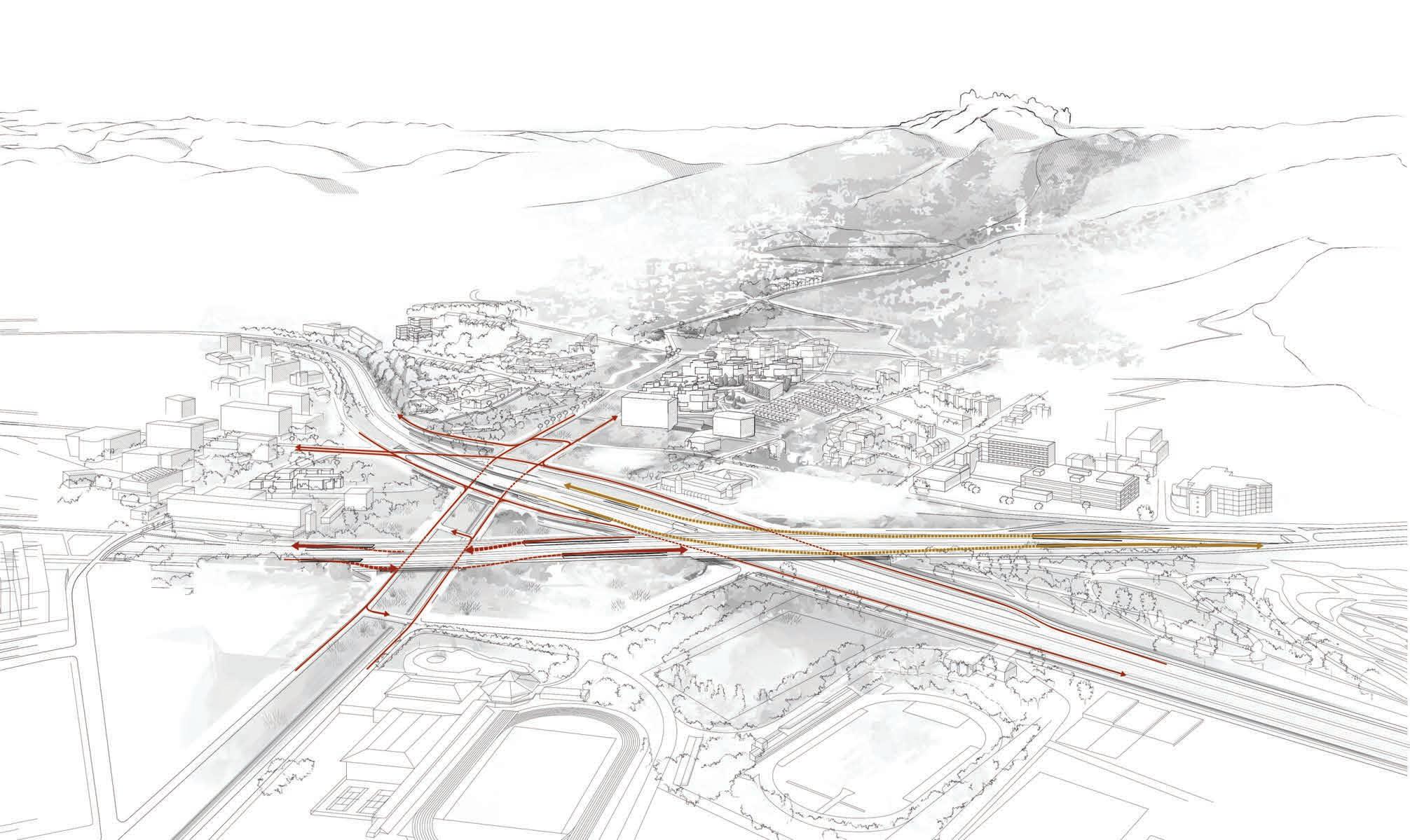 en altres casos és la ciutat la que es situa per sobre i la b23 circula deprimida respecte la cota de la ciutat, en aquestes situacions, i quan el gàlib ho permet, és quan es plantegen noves cobertures sobre la via, guanyant nous espais per a la ciutat en continuïtat amb els teixits urbans existents. en ambdós casos, ja sigui passant per sota la via o mitjançant la cobertura d’aquesta, es fa possible l’intercanvi dels futurs usuaris per accedir a les parades del bus-vao.