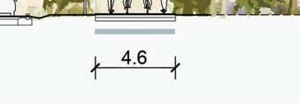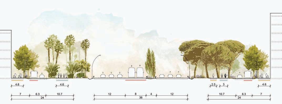 a l’altre banda dels passejos, i en contacte directe amb la ciutat es plantegen grans voreres (prenent de referència l’ample de l’eixample) que relliguen els camins i carrers existents i donen continuïtat als nous fronts edifi cats i als nous espais per a la mobilitat activa sota l’ombra dels arbres.