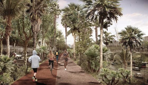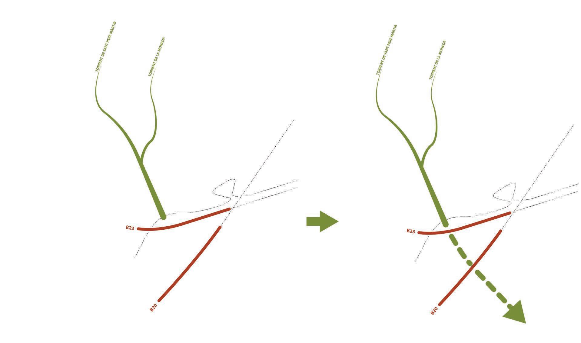 una avinguda metropolitana que promou les continuïtats ecològiques dins del territori, amb nous itineraris verds que perllonguen els passejos sota els arbres de la diagonal fi ns al riu llobregat i els connecten amb els sistemes d’espais lliures de les ciutats. nous itineraris envoltats de vegetació que esdevindran veritables passejos bioclimàtics que en contacte amb els parcs existents i la recuperació i transformació dels torrents tallats per la b23 es poden infi ltrar dins les ciutats.