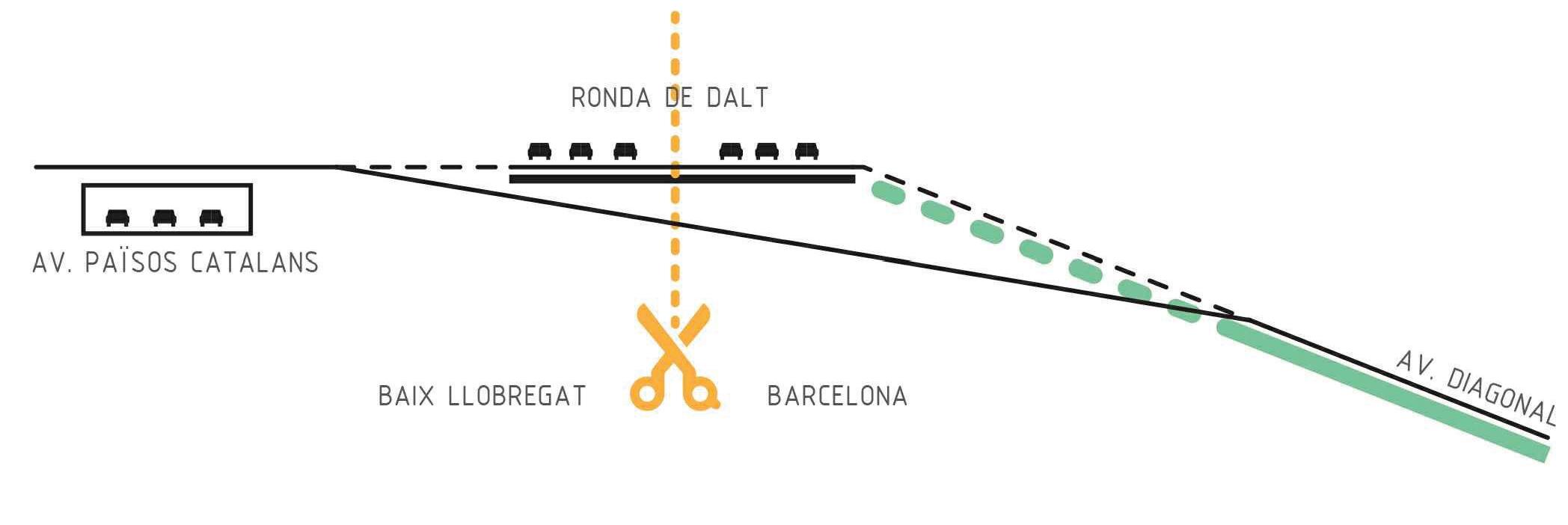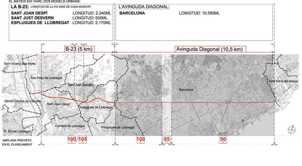 la construcció de la b-23 ha propiciat que a dia d’avui hi hagi un gran buit urbà que ha esdevingut un tall entre municipis i dins les pròpies ciutats. la situació actual d’aquests espais permet recuperar un espai per les ciutats que sense afectacions sobre les edifi cacions existents pot convertir-se en avinguda metropolitana que recuperi la voluntat del plà cerda. un gran eix urbà que connecti els dos rius, el llobregat amb el besòs, i recuperi la continuïtat dins dels municipis.