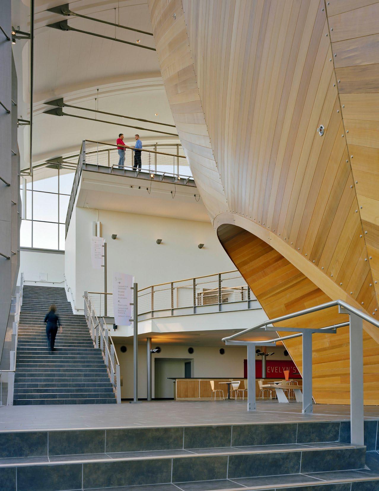 The design team took advantage of the site's challenging hillside location by positioning the facility's entrance at the highest elevation. From this easily accessible location, patrons descend through seven levels of the central atrium, which serves as the social hub of the building. The dramatic 1,200seat Concert Hall — which combines the refined acoustics and comfort of great concert halls of the past with 21st century technology and flexibility — is wrapped inside a “hull” of curved cedar planks, which hovers inside a glass exterior, providing a practical and elegant enclosure for the hall's extensive mechanical and circulation corridors.