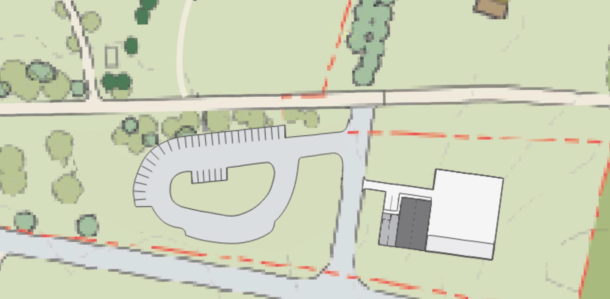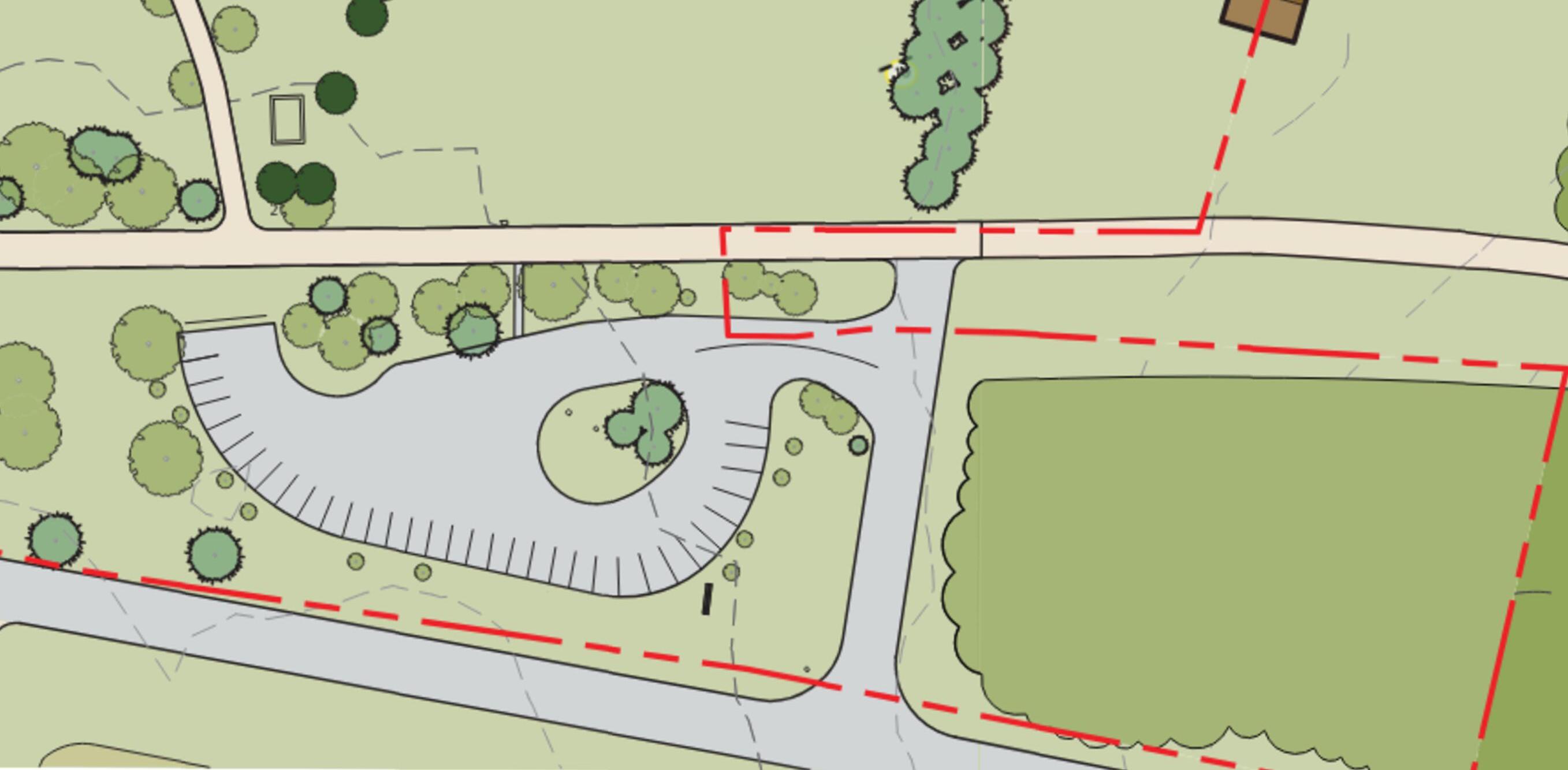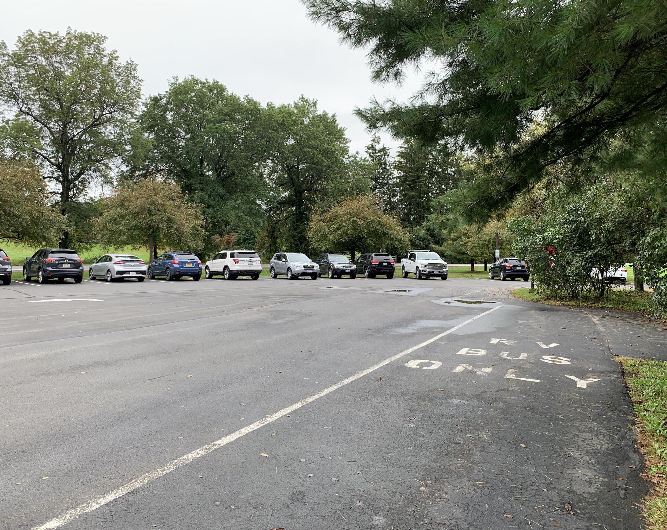 The National Park Service constructed an asphalt visitor parking lot in the triangle of land between the Old Post Road and Route 9H at the northeast corner of the property. There, a short asphalt entry drive from Route 9H turns left into the parking area. There is a large green island in the center of the lot which vehicles maneuver around to park in the 29 lined car parking spaces at the east side of the lot, including two compliant accessible spaces. Bus offloading and parking, which accommodates two buses, is located at the west drive aisle of the parking lot at the pedestrian path leading to the visitor center.