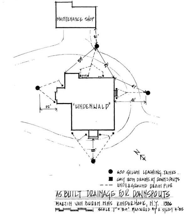 When Route 9H was built in the 1930’s, it followed much of the roadbed of the Old Post Road. A trace of this old road was preserved in front of the Van Buren property from which it continues north. It is currently maintained as an unpaved road and connects to the semicircular entry drive, though it is not accessible to public vehicles. The gravel, semicircular entrance drive follows the historic configuration, used by maintenance vehicles and pedestrians only. A gravel roadway connects to this drive at both the north and south sides of the house as well as to the existing maintenance area that lies to the west. The gravel continues up to the maintenance buildings garage doors which face the mansion and to a large gravel maintenance yard further west.