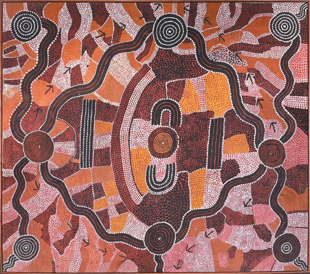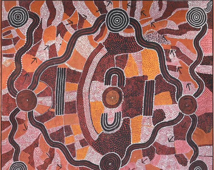 2.Kaapa Tjampitjinpa, “Dreaming at Mikantji,” 1975 (detail). Synthetic polymer paint on canvas, 68 7/8 x