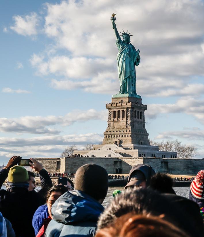 L to R: get up close to Lady Liberty aboard Statue City Cruises, the only way to reach Liberty Island and Ellis Island’s National Museum of Immigration; take in all of downtown and beyond from One World Observatory.