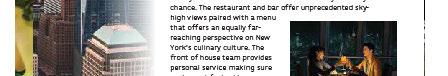 Have you ever dined from 101 stories in the sky? Now’s your chance. The restaurant and bar offer unprecedented skyhigh views paired with a menu that offers an equally farreaching perspective on New York’s culinary culture. The front of house team provides personal service making sure each guest feels at home.