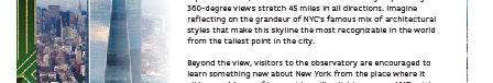 NYC is known for its constant evolution and we’ll also show you new shopping destinations, the latest on our five observatories, immersive experiences, exhibitions at some of the world’s finest museums, and many great pop-up venues. Have a great time and welcome to our city.