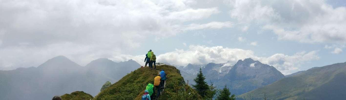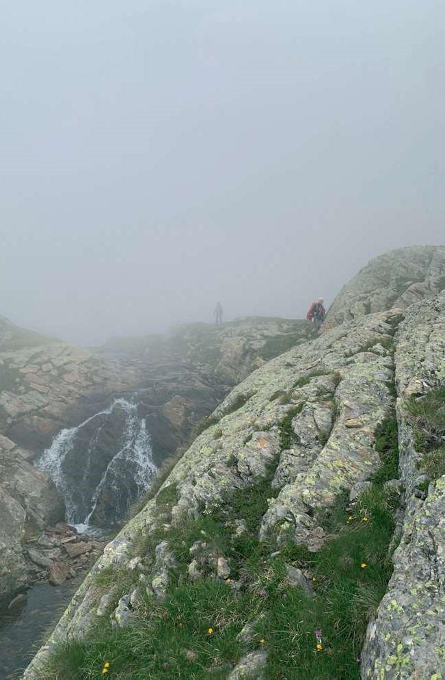 ZurRastfandenwireineWeidehütte mitBalkon.DieschützteunsvorübergehendvordemRegen.Weiterging’s danndurchdasKürentalzumGottesacker.Esgelanguns,derUnwegsamkeitaufdemGottesackermitSorgfalt zubegegnen.Esbliebunsauchgar nichtsanderesübrig!Zunächstwar dieOrientierungandenWegmarken einfach,aberdannstandenwirvor Schneefeldern,diewirlieberumgehen wollten.Aberbeimsoundsovielten bliebunskeineandereWahlalsdarüberzugehen,vorsichtigundmitBedacht.DerRegenhatteaufgehört,dafürwarderNebeljetztumsodichter. Schließlicherkanntenwirdirektvor unsdieStationderBergbahnanein paarLeuchten.Aufeinemsteinigen unddurchfeuchtetenWegwanderten wirnunabwärtsbiszurStationIfenhütte.Esklarteauf,sodasswirnoch einmaldenIfensehenkonnten.Wir nahmendieBahnabwärtsundkehrteninderAuenhüttenocheinmalein. VonunserenbeidenLeiternwardas einegutgeplante,beiallenWidrigkeitendesWettersundsonstigerHerausforderungengutgemeistertePremiere.WirhabendieNaturerlebt,wie sieist:schönundschroff,grandios undherausfordernd.Dasistesdoch, waswirindenBergensuchen!