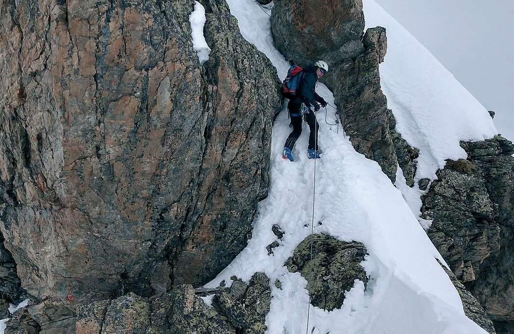 „Eisparcours“wiederholtenwirdas sichereBegehendieserSeilartenund übtendasUmsteigenaufFrontalzackentechnikmitUnterstützungdes Kopfstützpickels.NacheinemWechselderGruppenhattenallevonuns zahlreicheSkillserlernt,fürdiewirbei unsererTouramnächstenTaggute Verwendunghabensollten.Vordem großenTourentagstandjedochnoch diePlanungan,dievonunsTeilnehmendeninkleinenGruppenselbstbewerkstelligtwerdenmusste.Dassdie altbekannteFormelfürdasErrechnen derTourendaueraufBasisvonHöhenmeternundKilometernaufsteilen FirnflankenundausgesetztenGraten jedwedeGültigkeitverlorenhaben musste,warunsspätestensmitder leichtironischenAnkündigungeiner Kleingruppeklar,dassunsderAbstieg vommorgigenTourenziel,derWyssi FraumitÜberschreitungdesMorgenhorns,etwaeineStundekostenwürde.Essolltenvierbisfünfwerden… DieSonnewarnochnichtuntergegangen,alswirunsschoninsBettenlagerzurückzogen,wowirversuchten, etwasSchlafinderkurzenNachtzu ergattern.