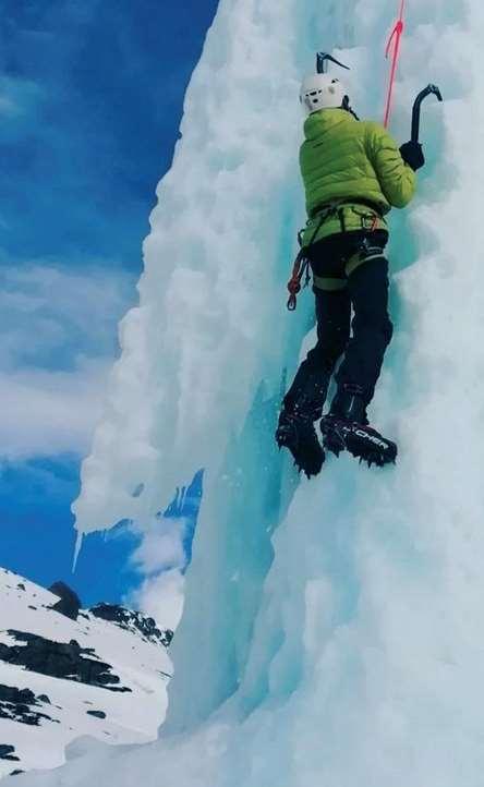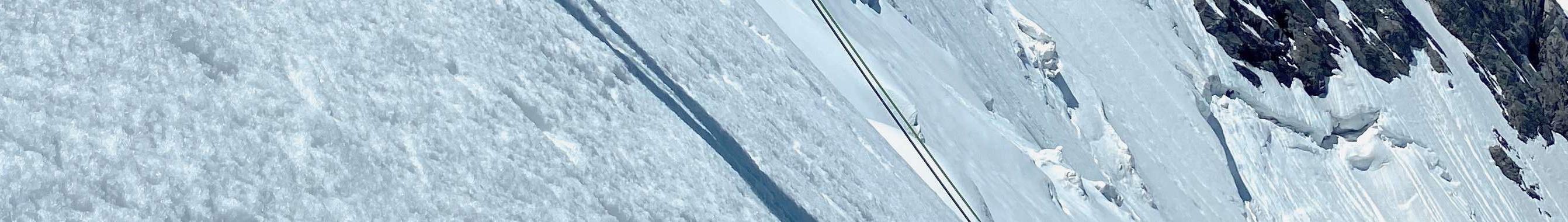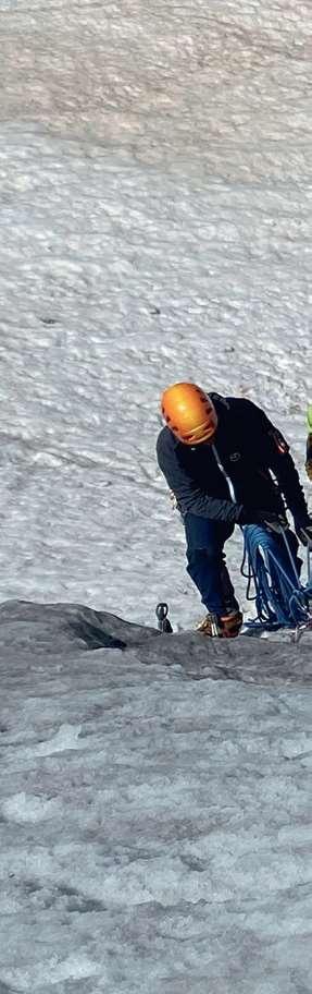 AmSamstagmorgenstürzteunsein SchildinderGaststubeineinekleineIdentitätskrise,kündigteesdoch „FrühstückfürBergsteigendeum 3:00Uhr,FrühstückfürWandernde um6:30Uhr“an.Wirfrühstücktenum halbsieben,ließenunsjedochnicht beirren...Gelassenstartetenwirin ViererseilschaftenzueinemnahegelegenenGletscherbruch,aufundneben demwirunserenAusbildungstagverbringenwollten.AneinerSteilwand imBruchübtedieHälftederGruppe denAufbaueinesStandplatzesimEis mittelsEisschraubenoderunterVerwendungderwundersamen„selbstausdrehendenEisschraube“,sowie dasFädelnvon„Abalakow“-Eissanduhren,welchessichfürdieweniger treffsicherenTeilnehmendenalskurzeGeduldsprobeherausstelle.Auch die„SeilschaftinAktion“,alsodas Vorsteigen,Nachholen,Standplatz bauenunddieüblichenSeilkommandos,wurdeimGletscherbruchnoch einmalwiederholt.DerzweiteTeilder GruppeübtesichinderZwischenzeit inverschiedenenGehtechnikeninFirn undEis.SogingesmittelsVertikalzackentechnikmäßigsteileHänge raufundrunter.IneinemmitFixseilenundGeländerseilenpräpariertem