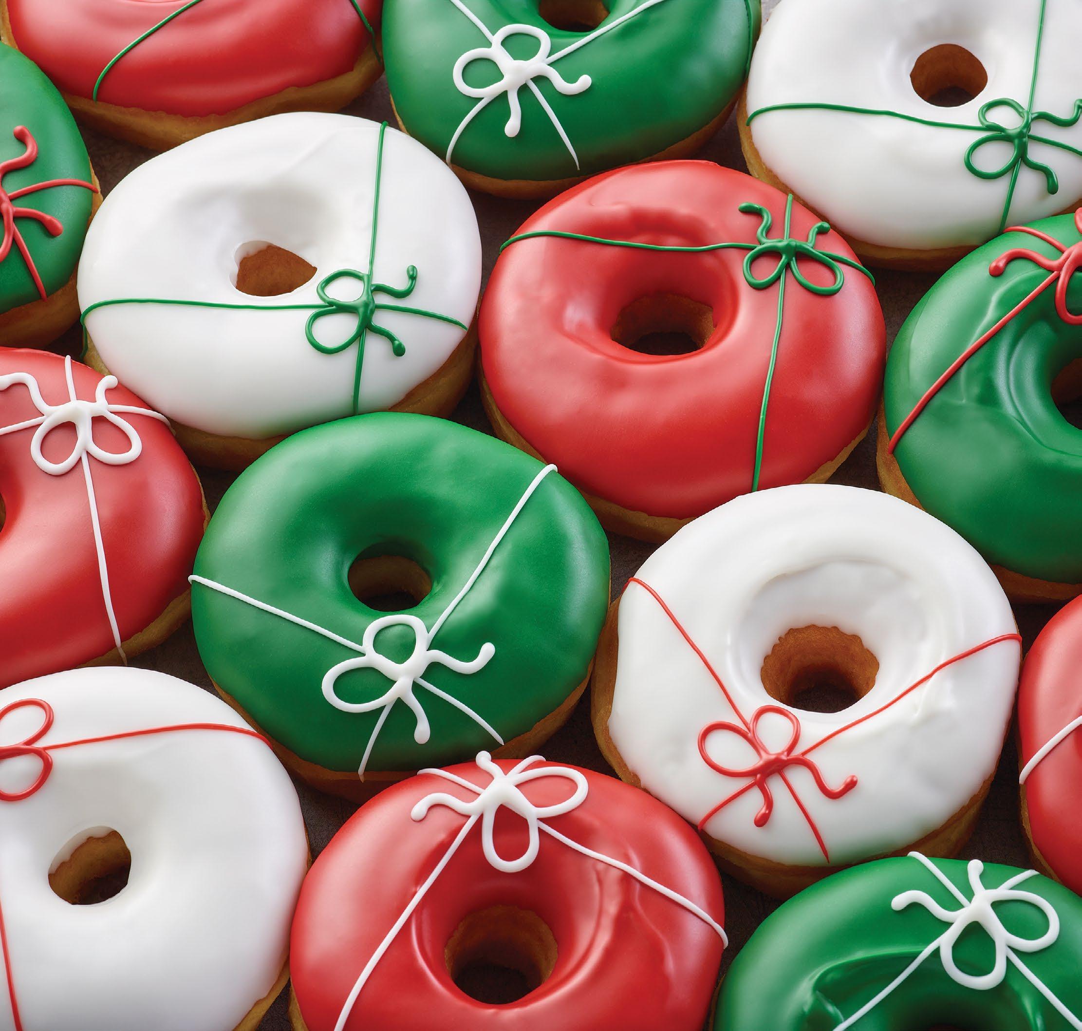 Prepare donut mix according to manufacturer’s instructions, shaping dough into rings. Fry and let cool completely. Combine white icing with red red and super red gel colours to create a red icing and green and brown gel colours to create a green icing. Dip 1/3 of the donuts into white, 1/3 into prepared red, and 1/3 into prepared green icings. Pipe icing bows on donuts in opposing colours to the base colour.