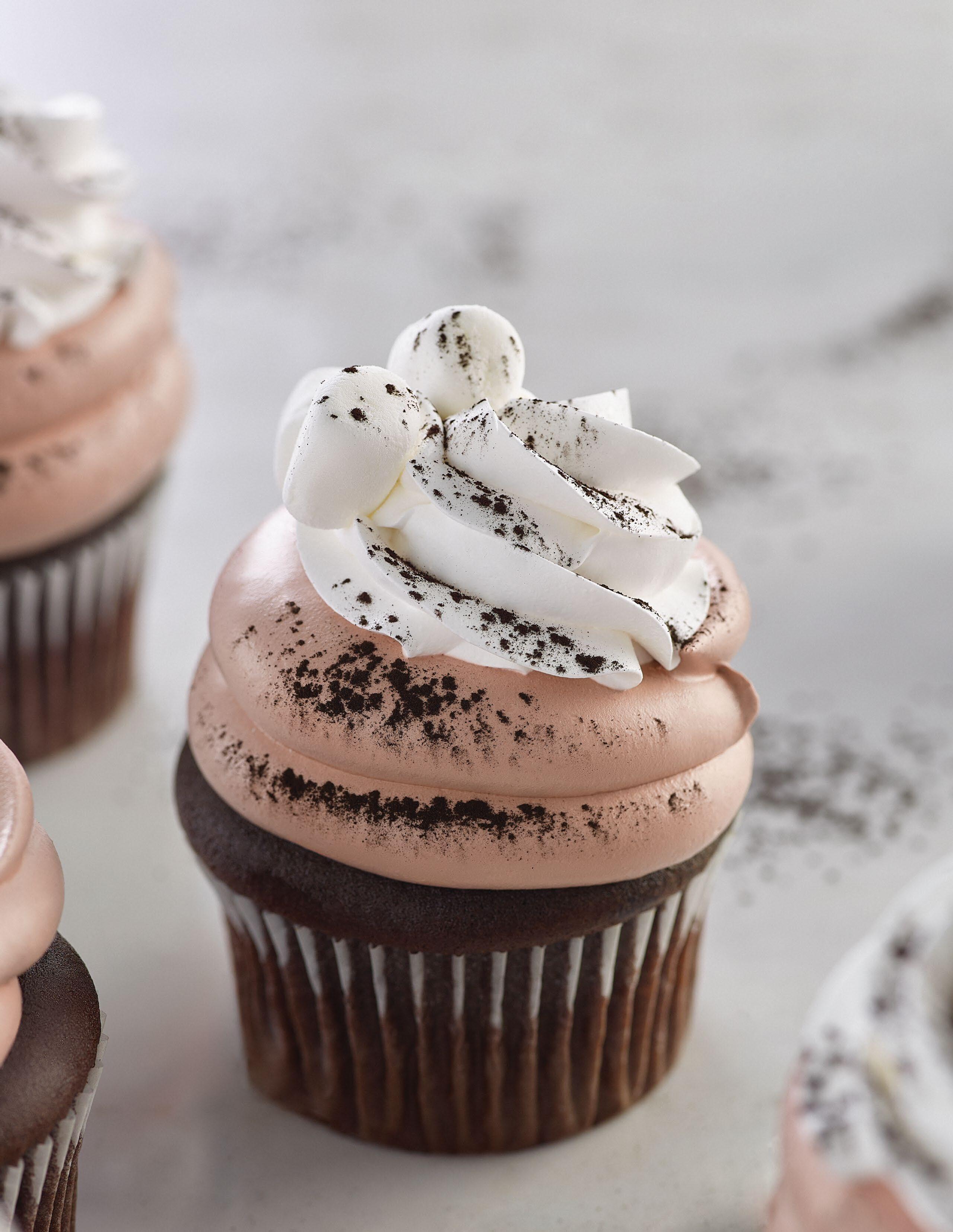 Line conventional size cupcake pans with paper liners. Prepare devil’s food cake mix according to manufacturer’s instructions. Use a #16 blue scoop to deposit 43g batter into each cavity. Bake at 350°F /176°C until cupcakes spring back lightly when touched. Let cool completely. Prepare vanilla whipped topping according to manufacturer’s instructions. Place vanilla whipped topping into a piping bag fitted with a large star tip and chocolate whipped topping into a piping bag fitted with a large open tip. Pipe a large swirl of chocolate whipped topping and then top with a rosette of vanilla whipped topping in the center. Finish with mini marshmallows and sifted cocoa powder.
