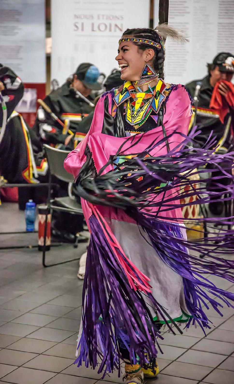 Dans le cadre du projet Jardin pour la paix du collège Dawson, une danseuse se produit pour l’ouverture du Skén:nen, exposition d’art et série d’événements mettant à l’honneur les travaux puissants et révélateurs d’artistes autochtones.