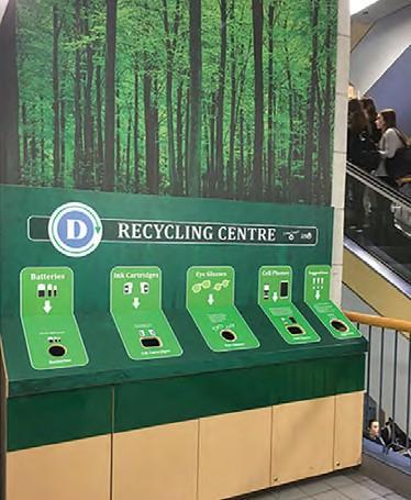 •Phase pilote du programme de compostage • en moyenne, 46 tonnes de papier, de métal et de plastique recyclées annuellement • bouteilles en plastique interdites sur le campus.