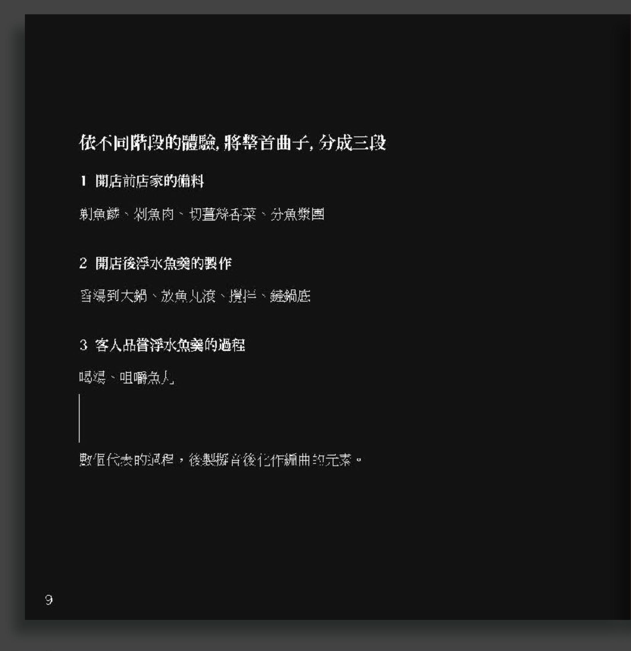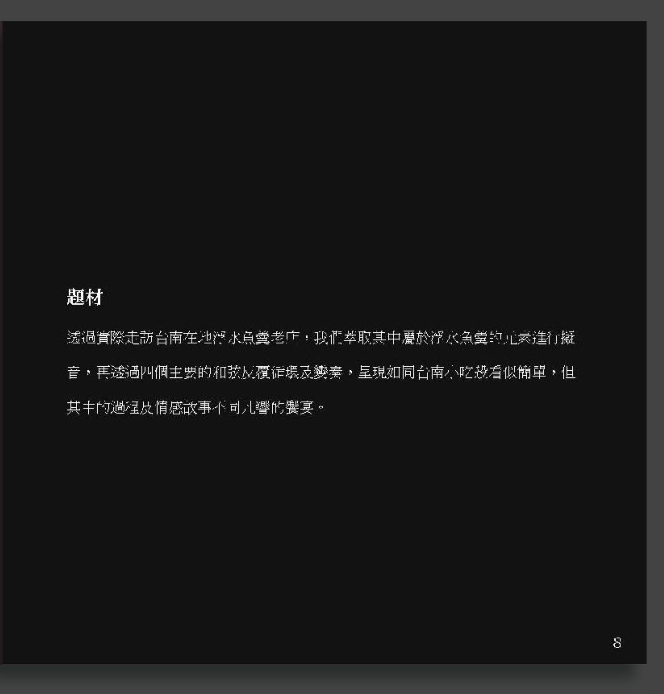 Music can stimulate the sense of taste through synesthesia. Therefore, we decided to display Tainan’s street food in the form of music in the group discussion, providing tourists with a new sensory experience.