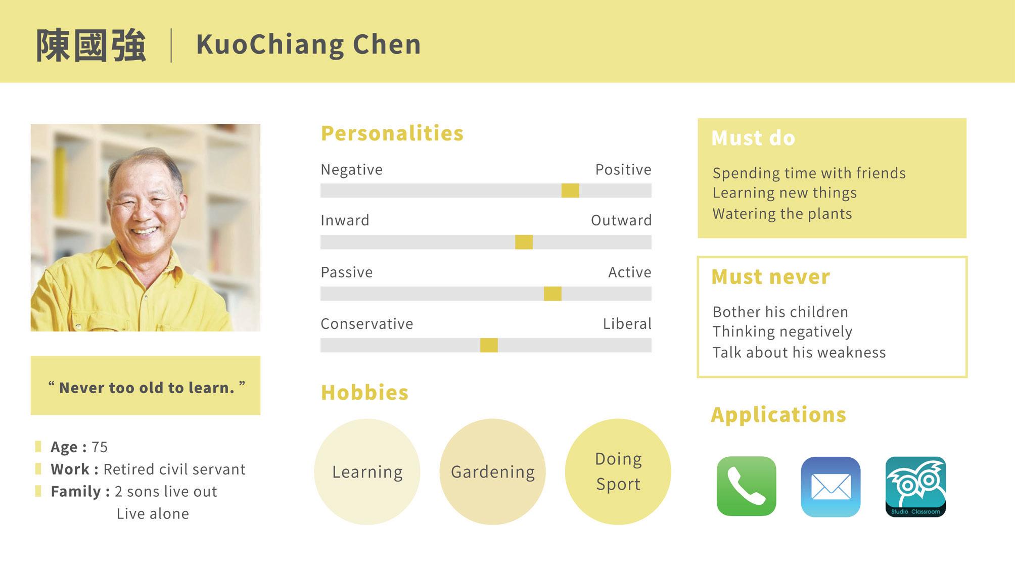 After completing the persona, we found that the elderly are generally afraid of burdening their children, so they hope to keep themselves healthy and positive. They tend to find activities that can become the focus of life in retirement, such as learning, planting, sports, etc.