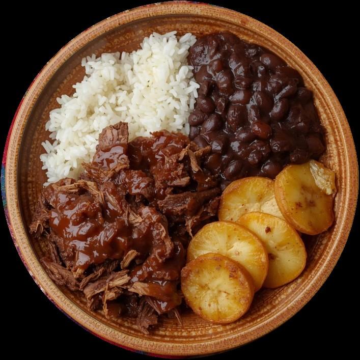 Servir en un plato colocando el arroz blanco, las caraotas negras, la carne mechada y los plátanos fritos en secciones separadas. El contraste de colores y sabores representa la esencia del pabellón criollo, plato tradicional de Venezuela.