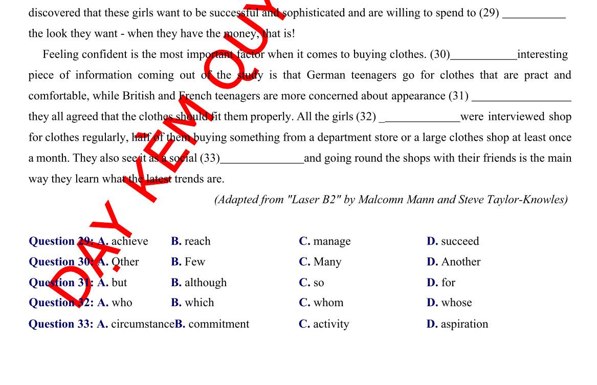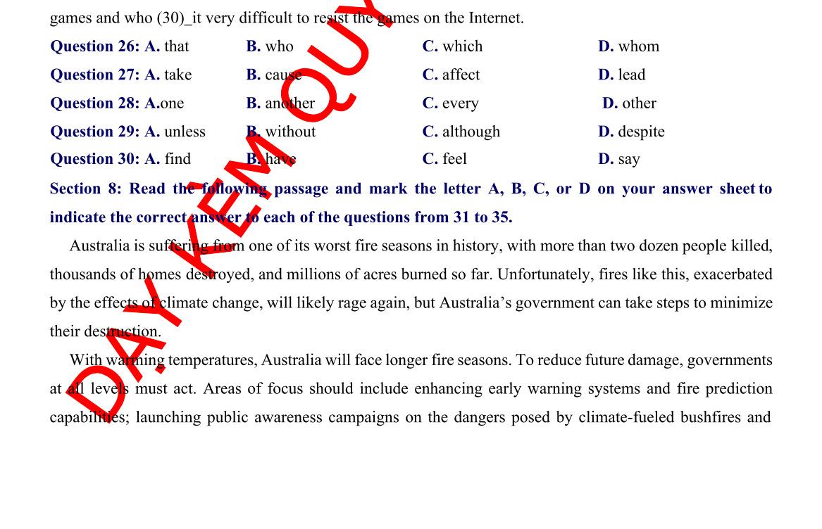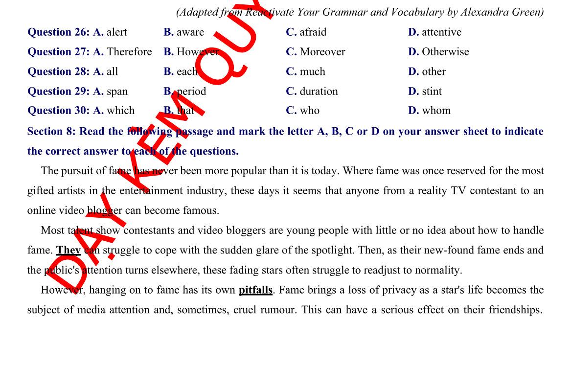 Section4:ReadthefollowingpassageandmarktheletterA,B,C,orDtoindicatethecorrectwordor phrasethat best fits each the numbered blanks.