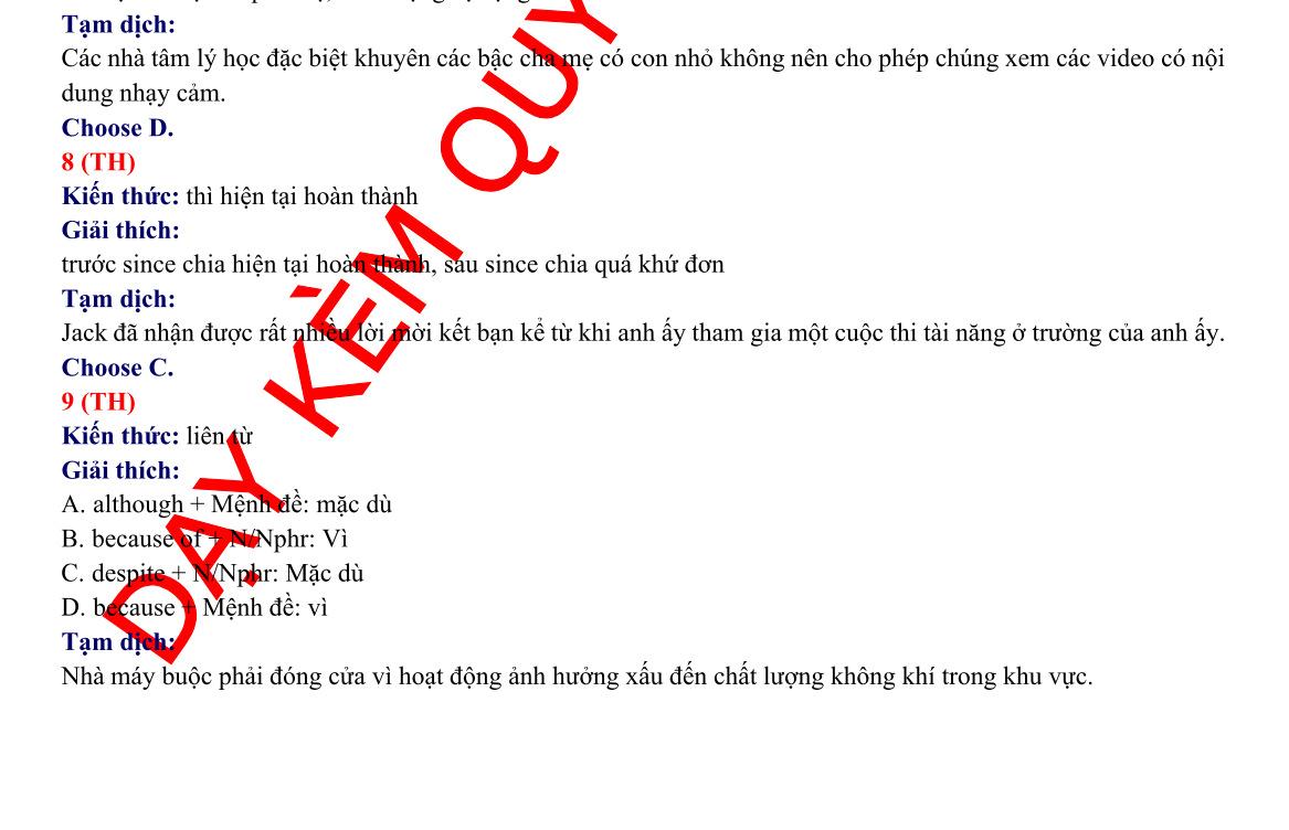 Giảithích: because+mệnh đềchỉ nguyên nhân although +mệnh đềtương phản becauseof +N/Nphrase in spite of+N/N phrase