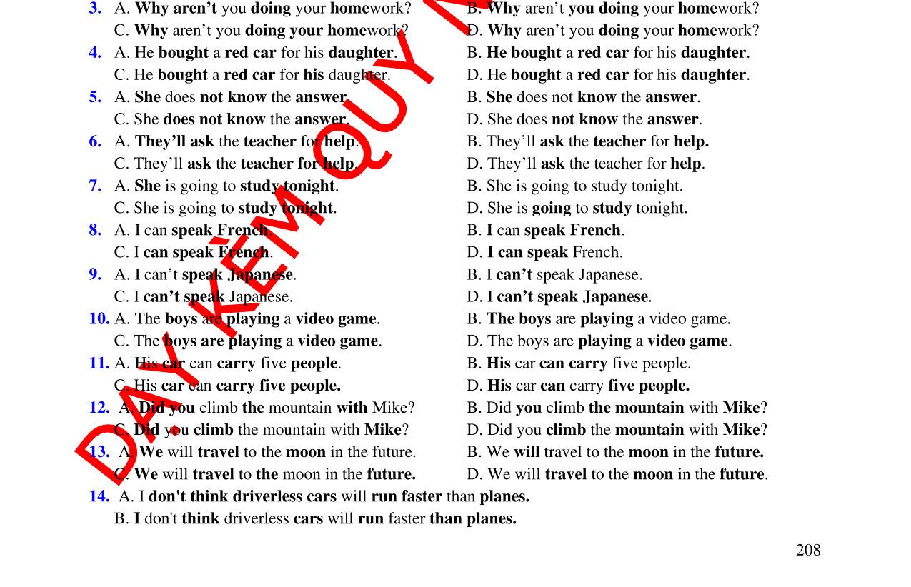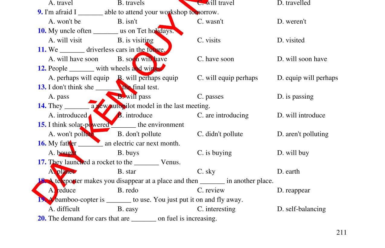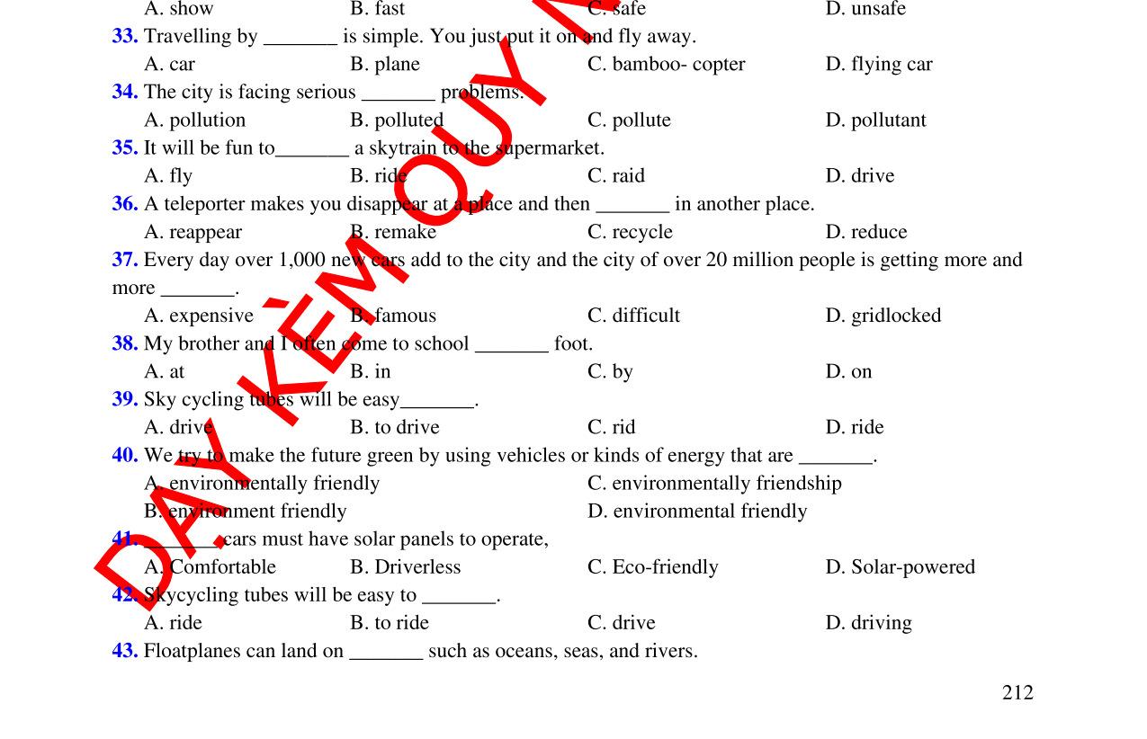 B.youare–ampreparing C.areyou-prepares D.youare-prepare 34. Onmywayhome,I___________tobuyabottleoffreshwater. A.stopusually B.usuallystop C.amusuallystopping D.amstoppingusually 35. Why___________thecompany___________fornewsourcesofdrinkingwater? A.does-looking B.do-look C.is-looking D.is-looks 36. Thechanginglifestyleofmodernman___________ourenvironment. A.polluting B.ispolluting C.don’tpollute D.arepolluting 37. Nowwe_________foracheap,cleanandefficientenergysource. A.look B.arelooking C.looks D.islooking 38. Nowscientists_________newenergysourcestoprotecttheenvironment. A.develop B.develops C.isdeveloping D.aredeveloping 39. I_________forapresentbutIcan’tfindanythinggood. A.amlook B.amlooking C.look D.arelooking 40. Doyouwanttoplayfootball?-Notnow.Iam_________dinner. A.having B.have C.tohave D.has