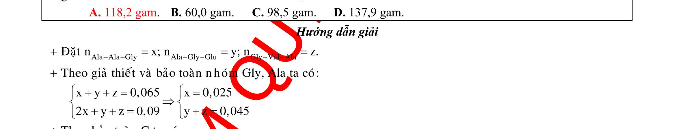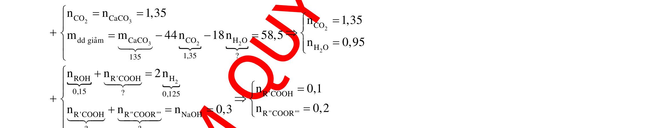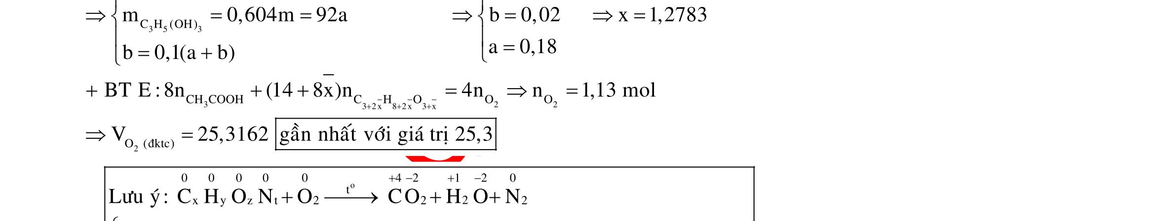 mmmmm Câu 28: 2 2 CO HO O/X,Y,Z COO NaOH (C,H) ddgiam XYZCOONaOH 3 (X,Y,Z) nx;ny n2n2n20,30,6 m12x2y21,620,3.2.1612,02x0,87 m100x(44x18y)34,5 y0,79 nnnnn0,3XlaHCOOCH 0,87 k C 2,9 0,3 X1 35 XYZ X (Y,X) YZ YZ 3 3 CHCOONa 3 25 nnn0,3n0,22C0,870,2225,375 0,08 nn0,08nn0,08 YlaCHCHCHCOOCH m 0,08.1088,64gam ZlaCHCHCHCOOCH Câu 29: