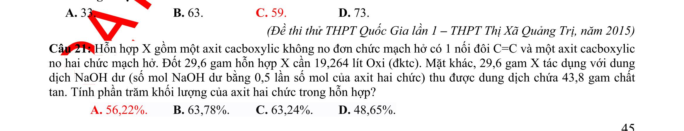 TN2:agamX CHCOONaCO o 2 2 O,t 2 2 23 n2n1 muoi 3 25 CO 2CHCOONa(2n1)CO(2n1)HONaCO nx0,07m(14n68)x4,38 CHCOONa:0,03mol x0,05;Dgom (*) CHCOONa:0,02mol n(n0,5)x0,095 n1,4 C C C 25 n0,03 n0,03;M50 (**) ClaCHOHC:khongñöôcñieuchetröctieptöchatvocô 25 25 3 25 3 NaOH 25 3 a412gam CHCOONaôTN1 CHCOONaôTN2 XlaCHCOOCH:0,03mol CHCOONa:2,46gam (*) (**)YlaCHCOOH:0,02mol CHCOONa:1,92gam mm 1m4,12gam am Câu 39: o NaOH t