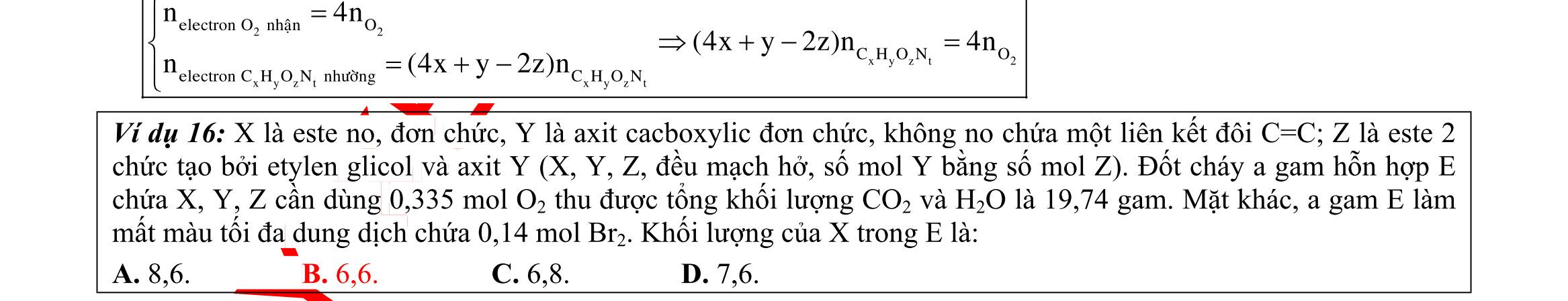 (X,Y)ZTCOHO (X,Y) CO 22 2 E (X,Y)TBr Z E 2 T 362 (X,Y)ZT nn3nnn0,05n0,02 n C 3,6 n2nn0,04 n0,1 n n0,01ZlaCH(OH) 2n2n4n0,28 Trong phản ứng của X, Y, Z, T với KOH, ta có : HO(X,Y) 2 ancolZ muoi KOH(X,Y)T (X,Y,Z)KOHmuoiancolHO 2 0,04?0,017611,160,176 0,0218 nn0,02 nn0,01 m4,68gam nn2n0,04 m mmmm Câu 26: