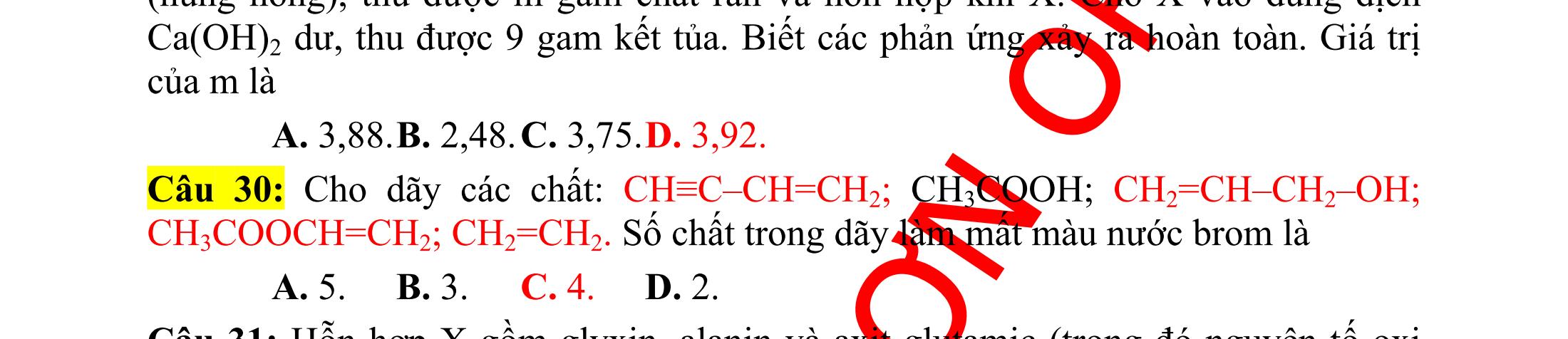 Ví dụ 3: Cho dãy các chất: stiren, ancol benzylic, anilin, toluen, phenol (C6H5OH). Số chất trong dãy có khả năng làm mất màu nước brom là A. 2. B. 5. C. 4. D. 3.