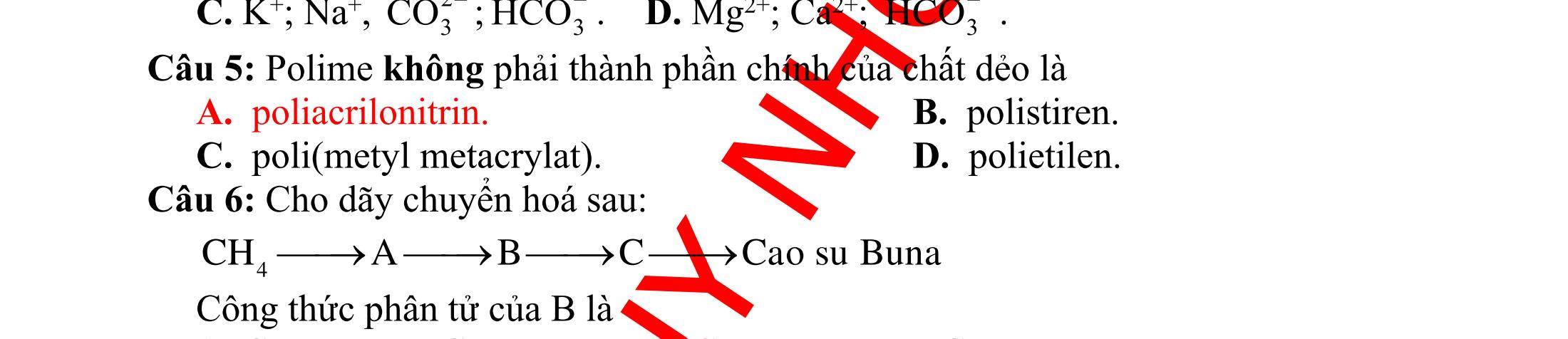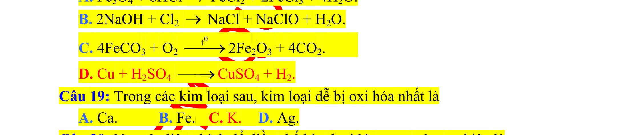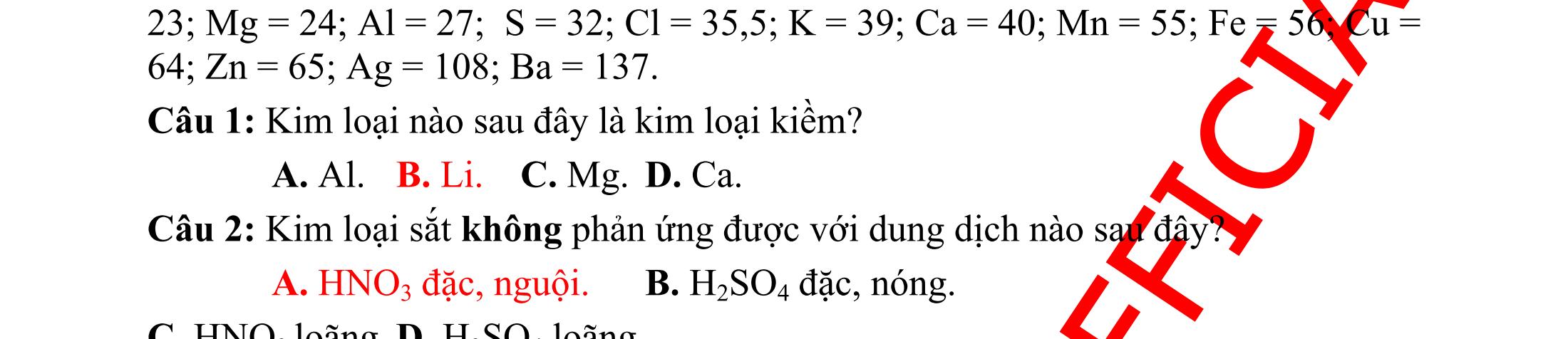 H = 1; C = 12; N = 14; O = 16; Na = 23; Mg = 24; Al = 27; S = 32; Cl = 35,5; Ca = 40; Cr = 52; Fe = 56; Cu = 64; Zn = 65; Sr = 88; Ag=108; Ba = 137. Câu 1: Phản ứng nào sau đây không phải là phản ứng oxi hóa – khử?