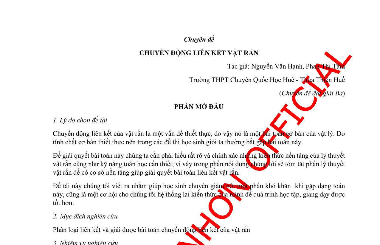 - Giải Nhì: Chuyên đề Chuyển động liên kết của vật rắn, tác giả Nguyễn Hải Dương, trường THPT Chuyên Lê Hồng Phong, Nam Định (trang 126 230)