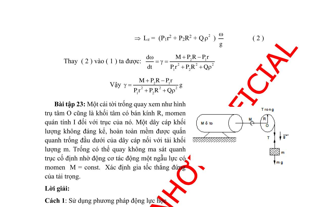 22 3 22 k(sin2kcos)sincos aag2,24 (cos2sin)ksincos +− →== +− m/s2 . Bài 14: Hai bánh xe là những đĩa tròn đồng chất có tâm lần lượt là O và O’ nối với nhau bằng dây curoa không dãn, không trượt trên các bánh xe (Hình 4). Bánh xe tâm O đang quay với vận tốc góc 0 thì một má phanh đè vào với áp lực Q, hệ số ma sát k. Biết bánh xe tâm O có khối lượng M và bán kính R, bánh xe O’ có khối lượng M’, dây curoa có khối lượng m.