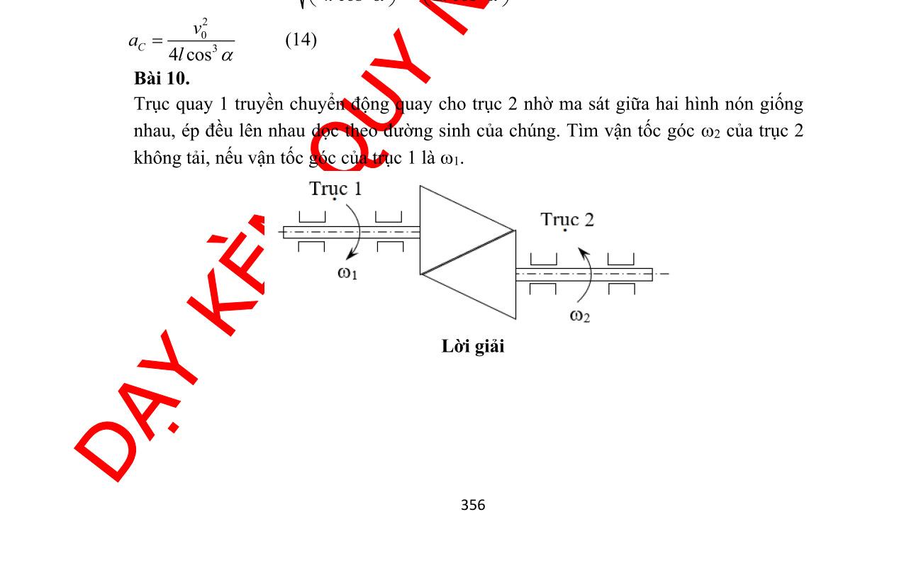 DẠYKÈMQUYNHƠNOFFICIAL 196 Cái nêm cố định nếu ms00 Fk.N 1 kktan0,176== . 2) Giả sử k > k1 và cái nêm đứng yên trên sàn xe. Ở thời điểm ban đầu t = 0, xe tải khởi động với gia tốc không đổi a > a1 a) Định luật II: Gms maFNmgma =++− Gms maFmgsinmacos =−−+ (1) 0Nmgcosmasin =−− (2) Phương trình động lực học của ống đối với G 2 ms I.mRR.F == (3) Khi ống lăn không trượt thì: G aR= (4) Từ (3) và (4) ta có: msGFm.a = , thay vào (1): G 1 a(acosgsin) 2 =− (5) b) Chứng tỏ ống chỉ có thể lăn không trượt nếu 2aa , tìm 2a . Từ (5) ta có: ms 1 Fm(acosgsin) 2 =− (6) Từ (2) ta có: Nm(gcosasin) =+ (7) Chúýrằng: 1 sin aagtang cos == acosgsin0 − ,điềukiện đểống lăn không trượt là: ms 1 |F|m(acosgsin)k|N|km(gcosasin) 2 =−=+