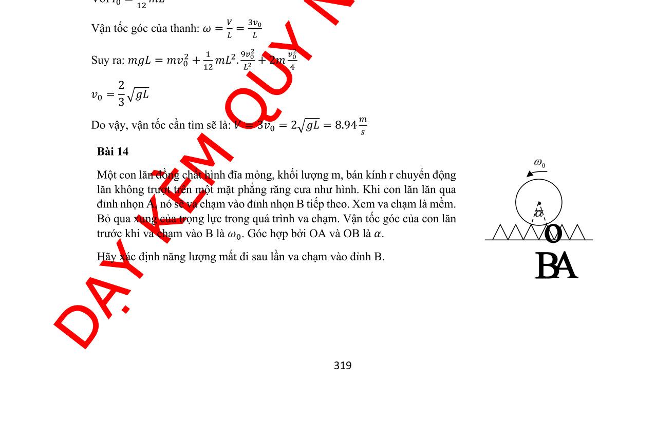 DẠYKÈMQUYNHƠNOFFICIAL 200 Các phương trình động lực học: 1mgTma −= s sin m TFMgMa +−= ( ) sm TFRI −= Ta có: 2 1 1 2, , 2 aaaRIMR === Giải hệ ba phương trình trên ta được: 4 83 mM ag mM = + = 0,426 m/s2 Vây khối trụ lăn đi xuống 3. Lực căng dây. ( ) 44() 2a121,3 8383 mMmmM TmgmggN mMmM −+ =−=−== ++ Lực ma sát nghỉ tác dụng lên khối trụ: s 23 2 m Ma FTN =− Điều kiện để khối trụ lăn không trượt: s cos 0,34 cos m ms FNMg F Mg = Bài 16: Ống đồng chất OA dài 3L, khối lượng m quay xung quanh trục thẳng đứng MN. Hai quả cầu nhỏ khối lượng m1 = m2 = m được nối với nhau bằng dây không giãn, không α = 300 B N Fms T mg Mg T