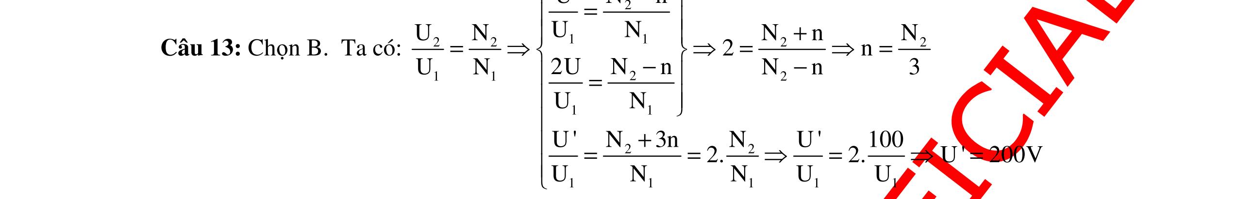 DẠYKÈMQUYNHƠNOFFICIAL 422 Mặt khác: UC2 = UCmax ZC2 = 22 L L RZ Z + 6,25ZC1ZL = R2 + 2 LZ 6,25( ZL – R)ZL = R2 + 2 LZ 5,25 2 LZ – 6,25RZL – R2 = 0 21 2 LZ – 25RZL – 4R2 = 0 ZL = 4 R 3 Khi đó: 22 22 L C2 L 16 RZRR25 9 ZR 4 Z12 R 3 + + === Hệ số công suất của mạch: 2 2 2 2 RR cos0,8. Z 425 RRR 312 ϕ=== +− Câu 74: Chọn D. Ta có: () 2 11 2 21111 12 2 12 22 2 12 2222 11 L LCC11 CC LC11 LL L CC LCC ω= = ω ω== + ω= = + ω Với: 12 12 12 2222 1122112112 111111CC LL CCCCCC ω=ω +=+=+= ωωωω+ () 2 2 1 1 12 12 12 1 CC LL CC ω==ω ω=ω + + Câu 75: Chọn A. Khi ω=ω3 thì () ()() +− == ++− 22 LC MBMB 22 Lc rZZ UIZU RrZZ Nhận thấy MBminU ⇔=⇔π= = πππ 5 LC 215.10 ZZ1003.CF. 31003C3 Lúc này, mạch cộng hưởng nên: == = 21max1max 213 IIIII. 3 21 Khi ω = ω1 và ω = ω2 thì dòng điện hiệu dụng qua mạch có cùng giá trị = 1max 3 II 21 nên: == 12 21 ZZR 3 () () () ⇔++ω−=++ω−=+ ωω 2 2 2 2 1 2 1 2 1121 RrLRrLRr CC3