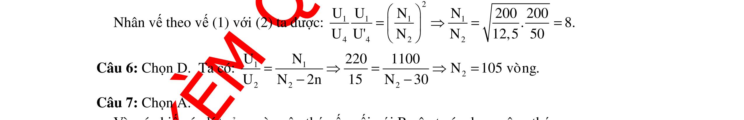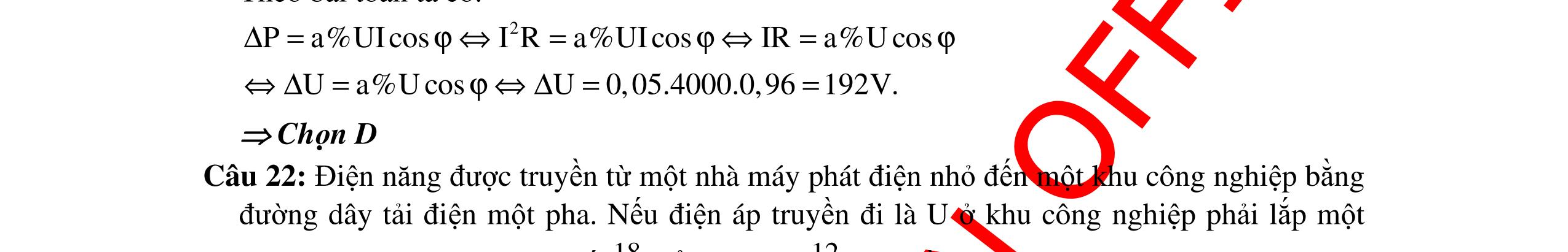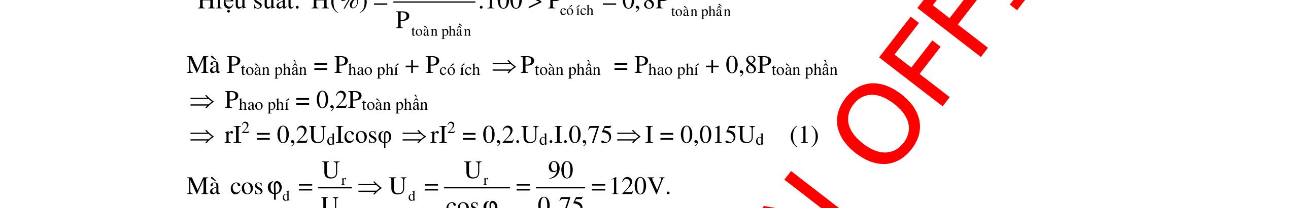 DẠYKÈMQUYNHƠNOFFICIAL 451 Câu 5: Chọn A. Từ công thức: =ϕ=ϕ 2 22U PcosPcos R coäng höôûng π == 2 P200cos100W. 4 Câu 6: Chọn B. Áp dụng công thức: =ϕ 2 2U Pcos R ϕϕ = =≈=+ ϕϕ 2 2222 1111 PcoscosP 1,2247100%22,47% PcoscosP . Câu 7: Chọn C. Cách giải 1: Theo đề dễ thấy cuộn dây không cảm thuẩn có r. Với 22 dL ZrZ =+ . Trên giản đồ do cộng hưởng: LC ZZr3 == Theo đề cho: Rdd UURZ2r = == Lúc đầu: () () () 1 22 2 12 L UUUU I Z 2r3RrZ 2rr3 ==== ++ + (1) Lúc sau: 2 2 UUUU I ZRr2rr3r ==== ++ (2) Từ (1) và (2) ta có: 1 2 I 3 I2 = (3) Công suất: ( ) () 22 111 22 221 PIRr3rI (4) PIRr3rI (5) =+= =+= Từ (3), (4) và (5) ta có: 22 11 12 22 PP3333PP.10075W PI2444 === === . Cách giải 2: Trên giản đồ vector: 2 1 Z 3 cos Z62 π == (1) Vì cùng U và do (1) nên ta có: 12 21 IZ 3 IZ2 == (2) đa giác tổng trở lúc đầu 1dZRZ =+ đa giác tổng trở lúc sau 2dC ZRZZRr =++=+ ZL - ZC = 0 π 6 LZ1Z I CZ R r dZ π 3